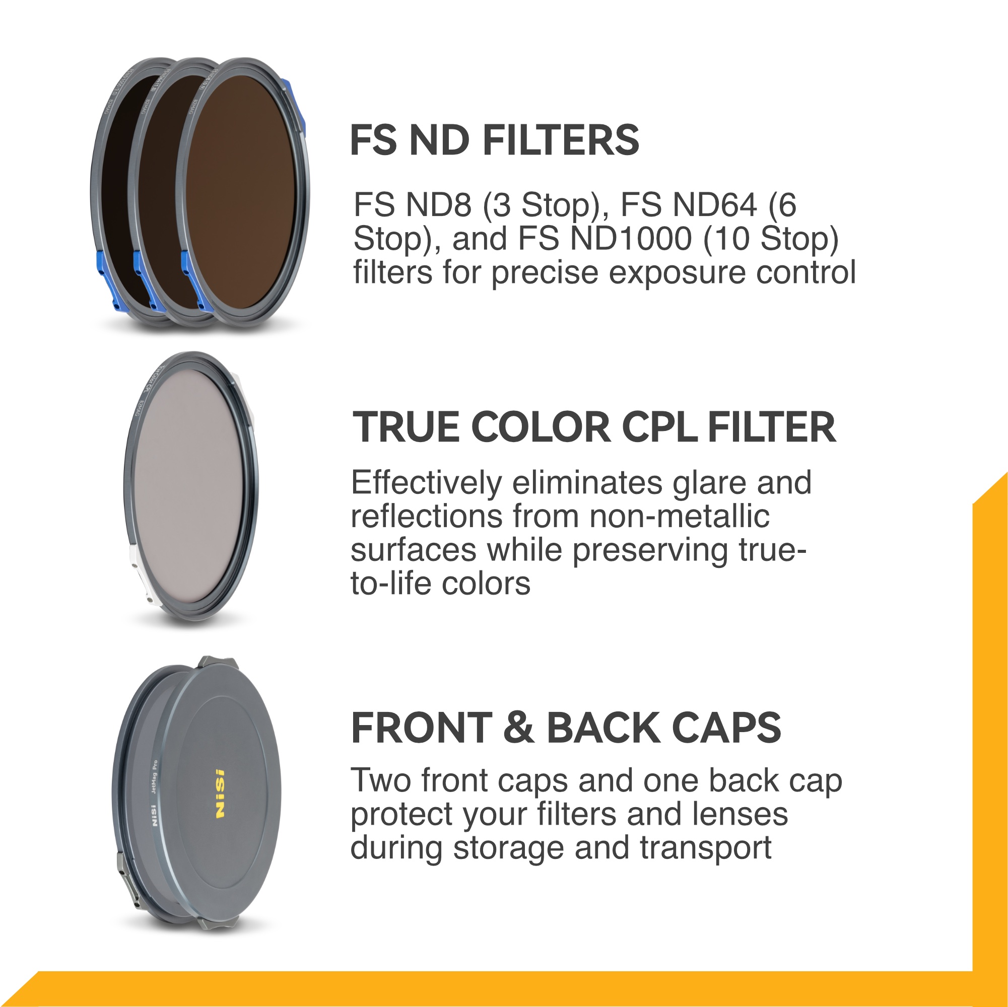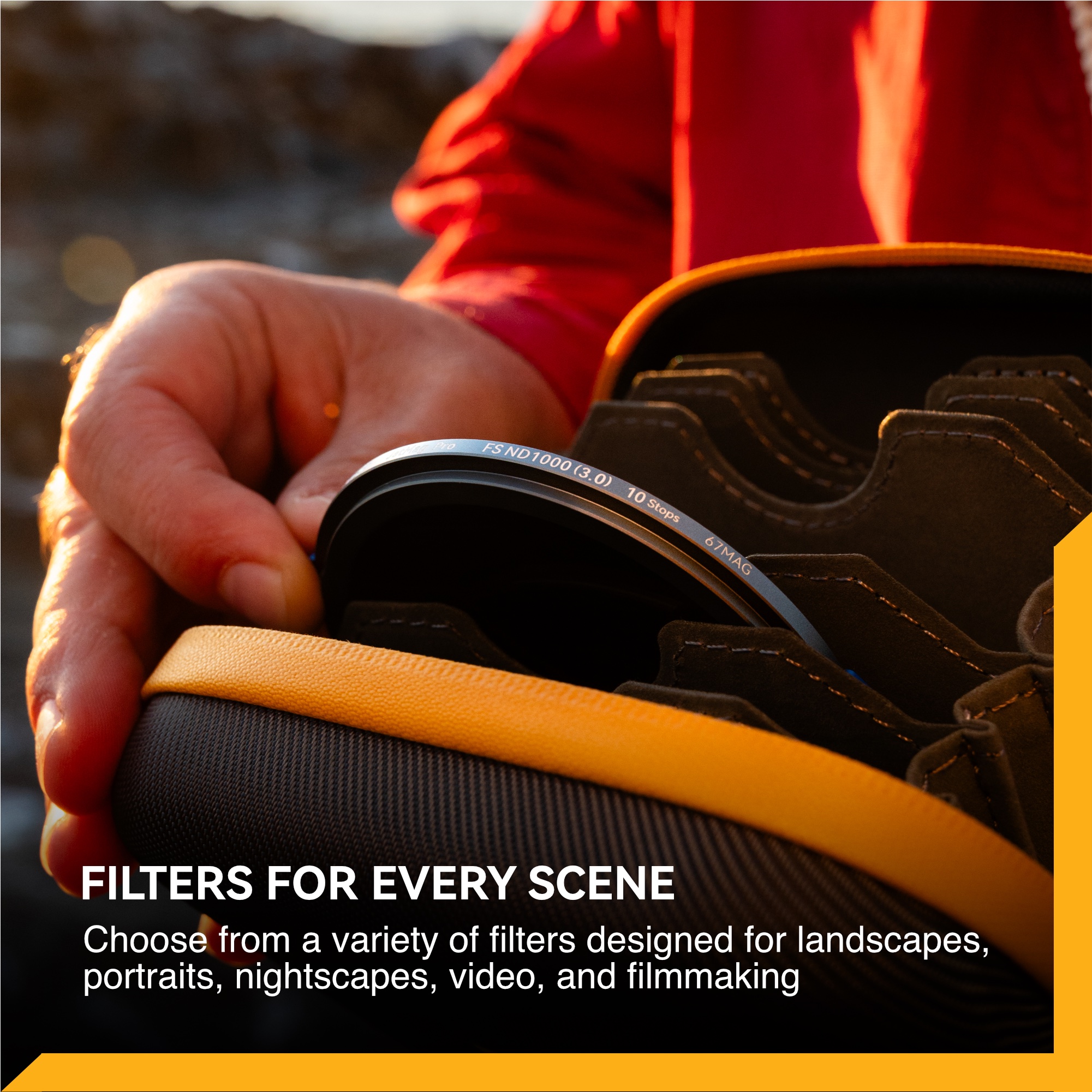 This comprehensive magnetic ND filter kit provides everything you need for professional landscape photography. The kit includes three premium ND filters: the FS ND8 (3 Stop) for subtle motion blur and wider apertures, the FS ND64 (6 Stop) for stunning sunrise and sunset long exposures, and the FS ND1000 (10 Stop) for ultra-long exposures in bright daylight. You’ll also receive our True Color magnetic CPL that eliminates reflections without introducing any color cast.